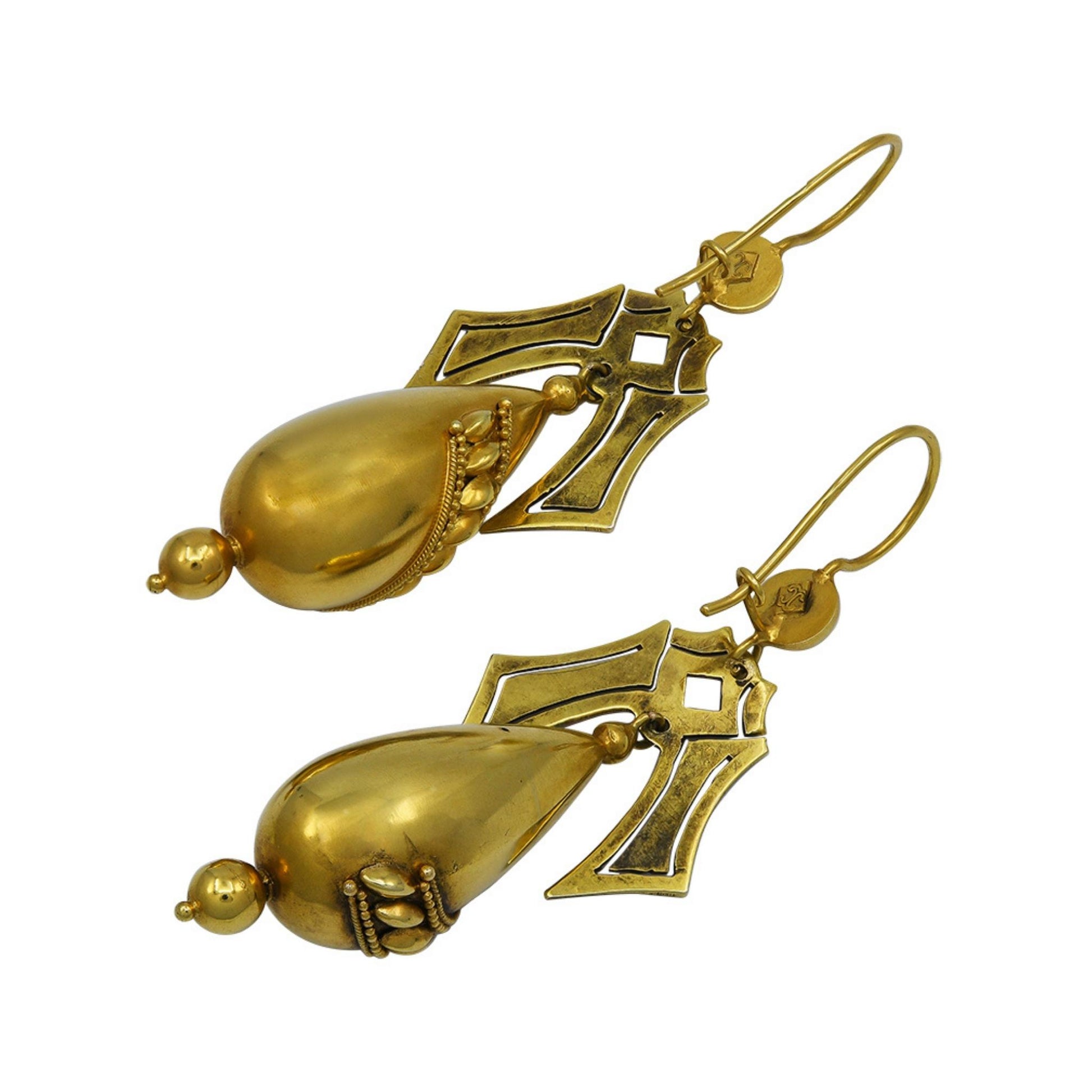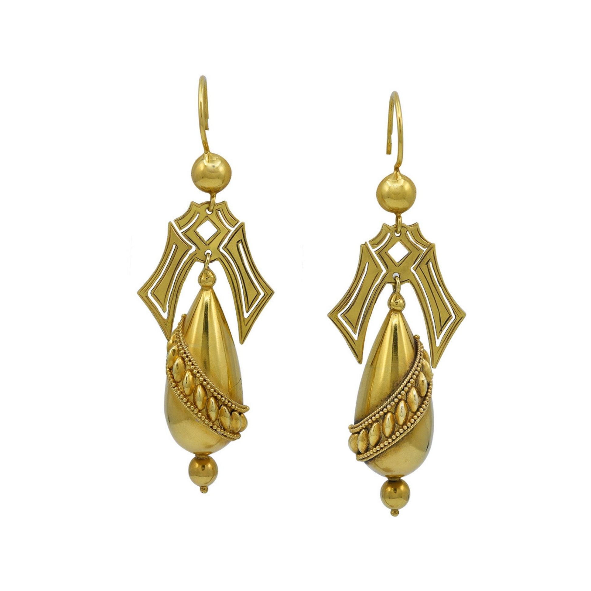 Etruscan Revival 15kt yellow gold hollowform drop earrings decorated with granulation and lentil motifs bearing maker's marks for Castellani, the earrings measure app. 2 5/8 inches long by 7/8 inch wide (at the widest point) and weigh app. 10.0 grams, Victorian, ca. 1870s.