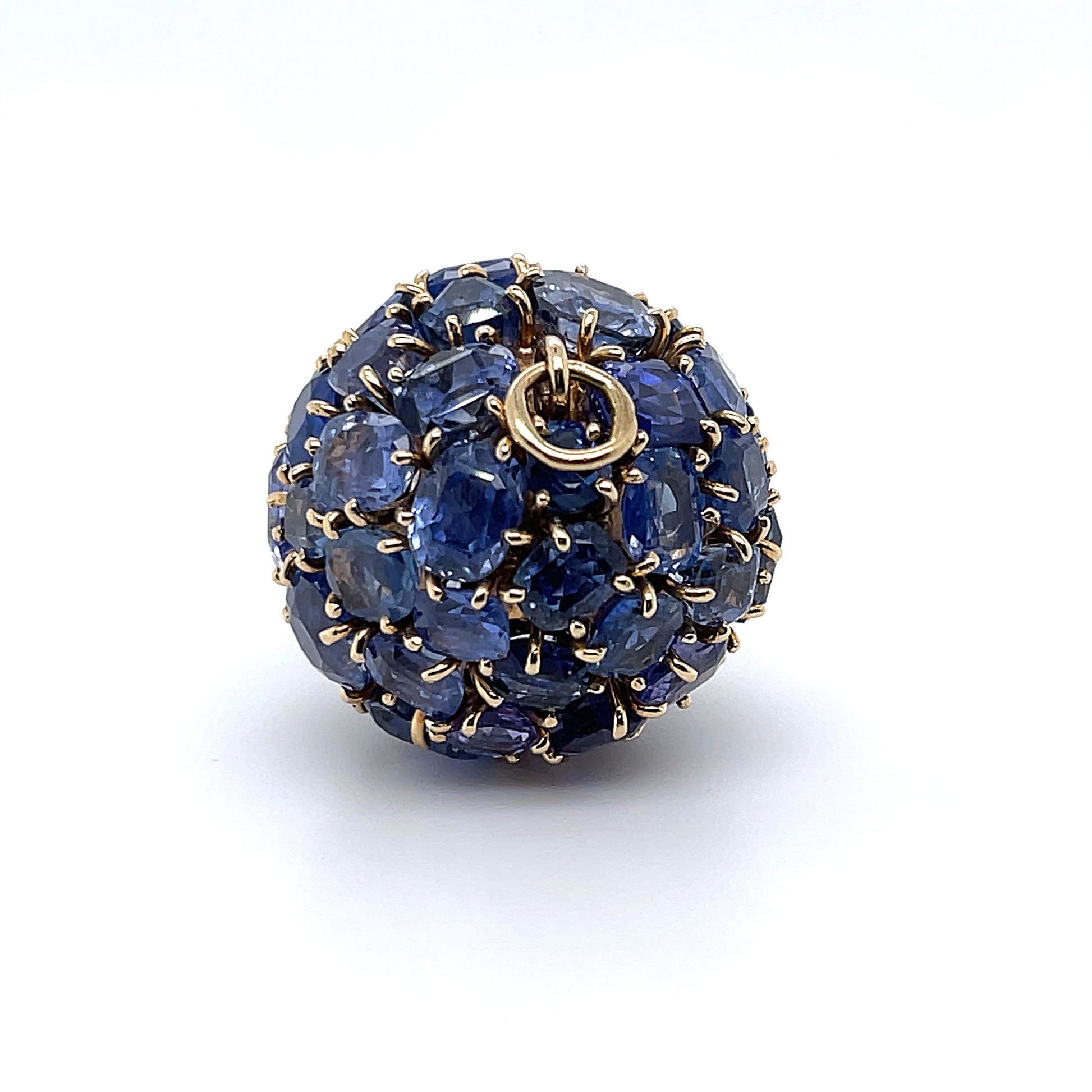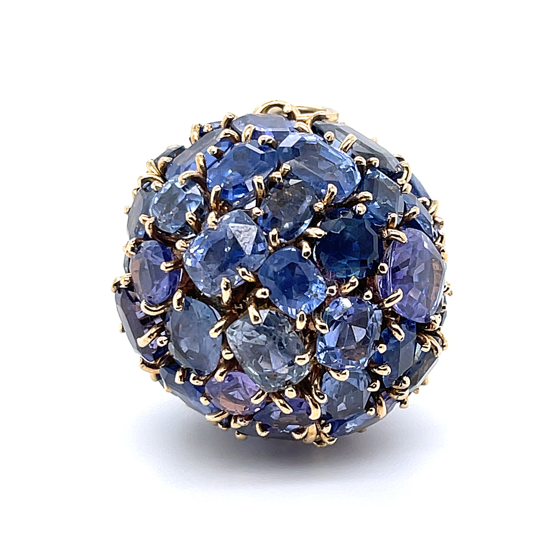 The large, spherical pendant designed as numerous blue and purple sapphires (app. 100 carats tw) in varying shapes prong-set in a yellow gold ball, suspended from a flexible gold bail, American, ca. 1940, measuring approximately 1 1/4 inches diameter, weighing approximately 42.6 grams.